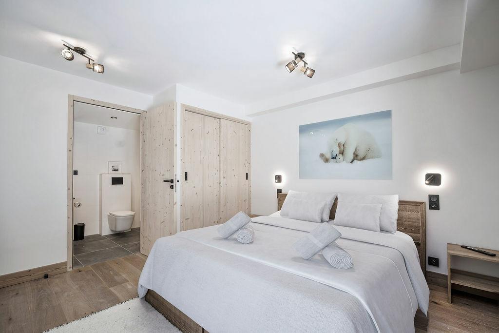 Bedroom 1: double bed with adjoining bathroom (sink, bathtub, heated towel rail, toilet), closet, television, terrace